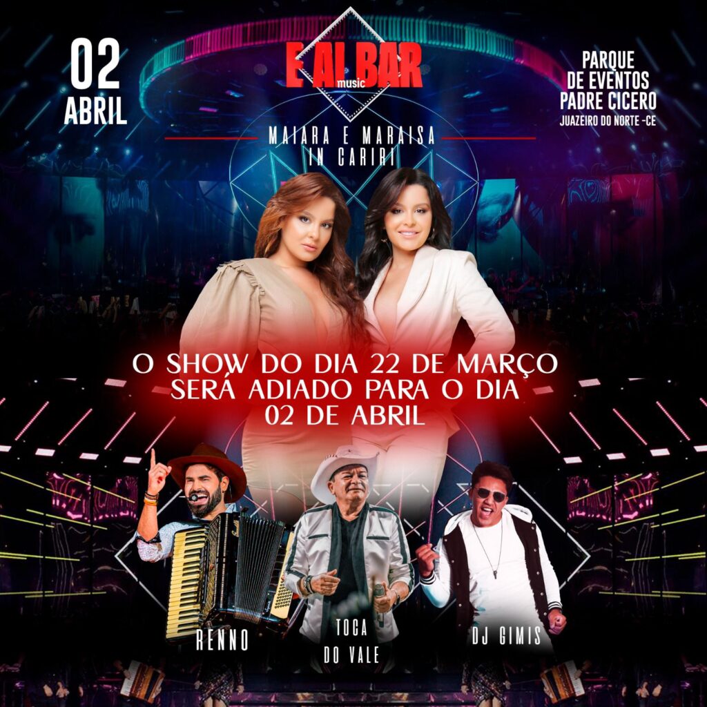 O show de 22 de março agora foi remarcado para 02 de abril de 2023 foi remarcado a pedido do escritório da dupla sertaneja Maiara e Maraísa!