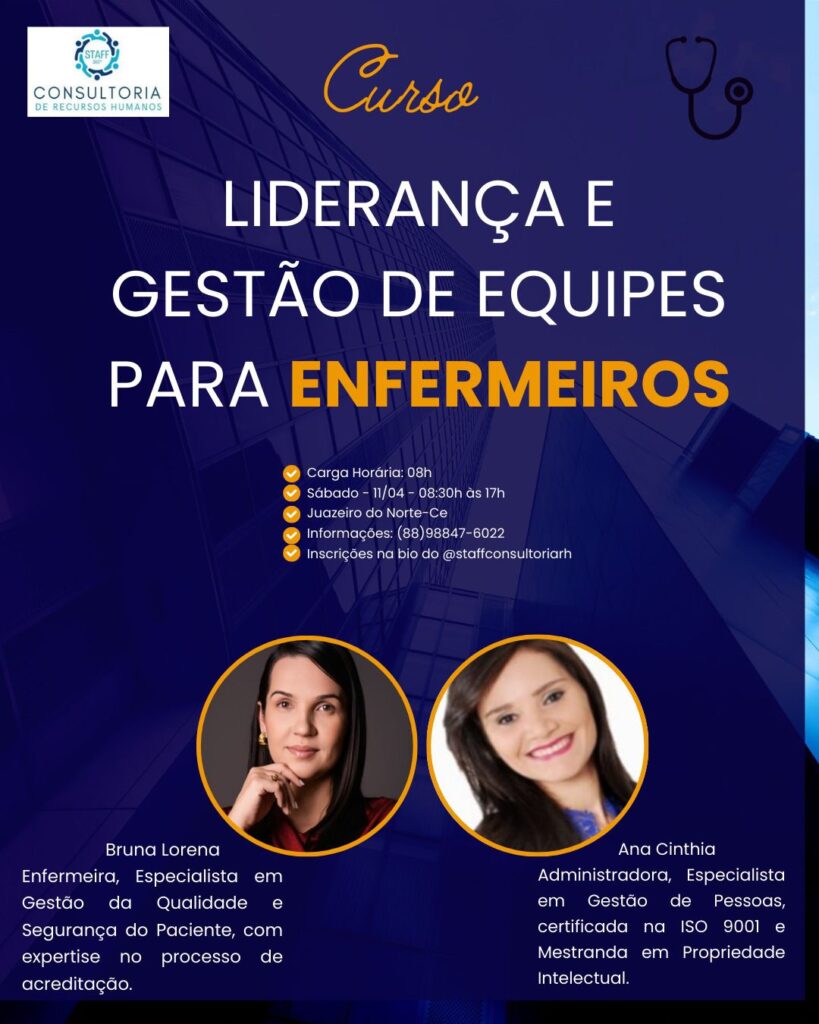 A cidade de Juazeiro do Norte recebe, no dia 11 de abril, o curso “Liderança e Gestão de Equipes para Enfermeiros”, voltado a profissionais da enfermagem que desejam aprimorar habilidades de coordenação, organização e desenvolvimento de equipes na área da saúde.